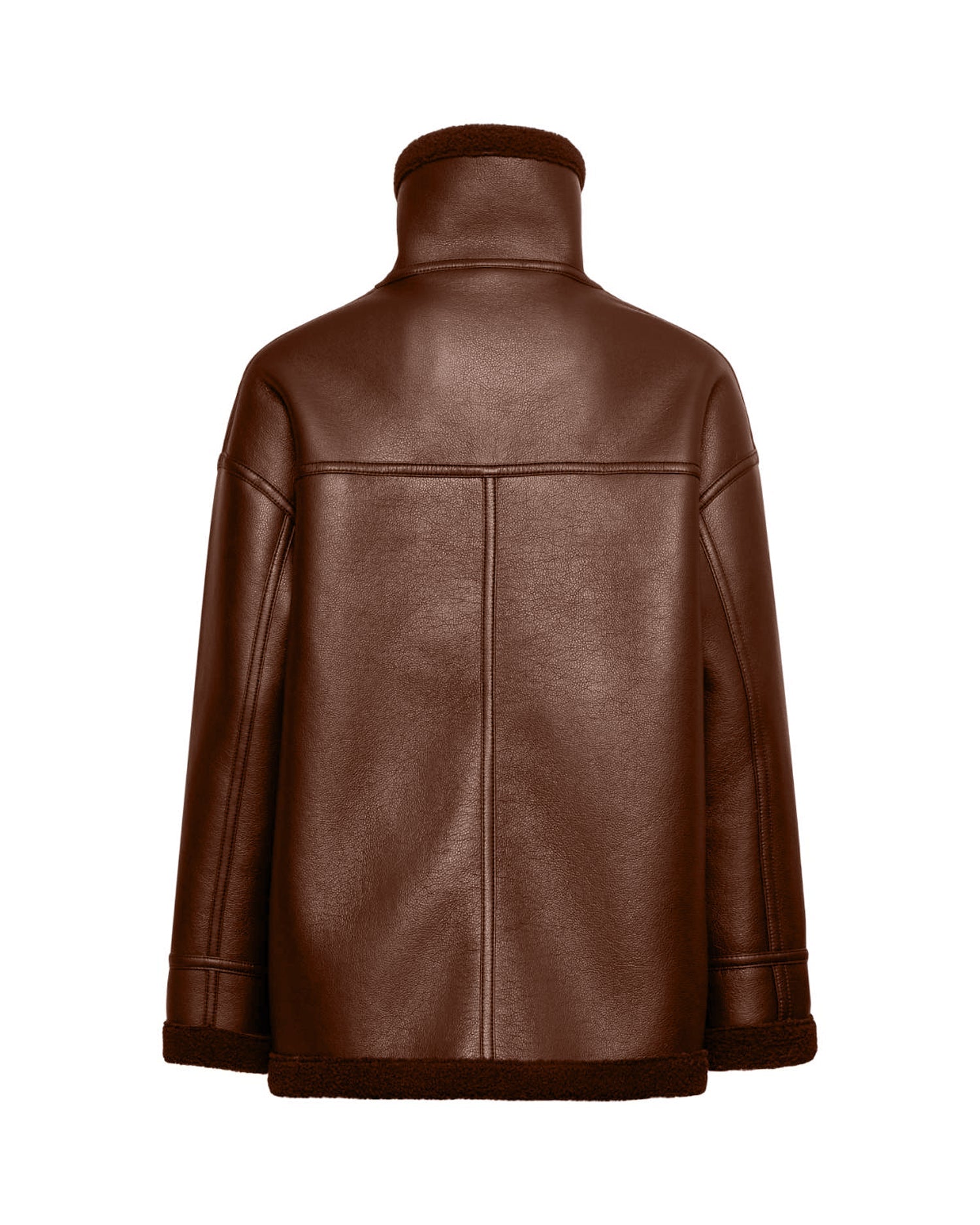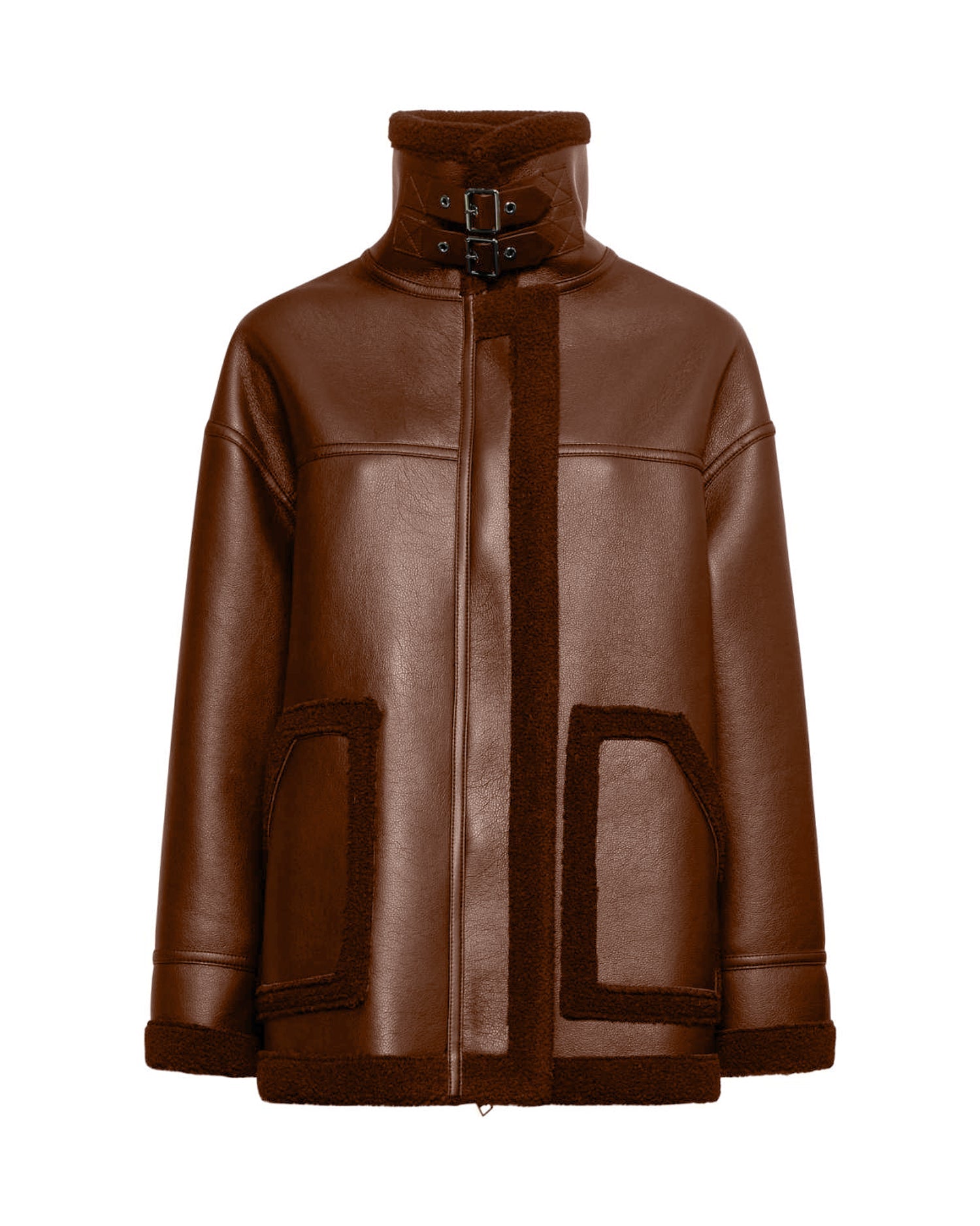 Una giacca strutturata dal look contemporaneo, con finitura effetto shearling opaco e inserti a contrasto. Il collo alto con fibbia aggiunge carattere e funzionalità.
